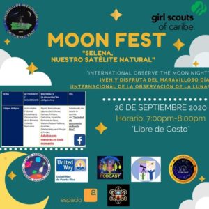 San Juan, PR, 24 de septiembre de 2020 — La Sociedad de Astronomía de Puerto Rico Inc. (SAPR) organización avalada por el NASA Puerto Rico Space Grant Consortium, en colaboración con el Club de Astronomía del Caribe Girls Scout Council, desea invitar al público general a la celebración de “La Noche Internacional de Observación de la Luna 2020” a llevarse a cabo de forma virtual este próximo sábado 26 de septiembre de 7 p.m. a 8:00 p.m