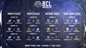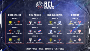 El calendario de la tercera temporada de la Basketball Champions League Americas (BCLA) fue confirmado por el equipo operativo y la Junta Directiva. La tercera temporada se llevará a cabo desde diciembre de 2021 hasta abril de 2022 y la competencia se jugará en formato de burbujas, en siete países y varias ciudades de América.