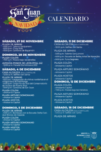 Se informó que el sábado, 27 de noviembre en la Plaza de Armas, estará a las 5:00 p.m. Talento Sanjuanero; a las 6:00 p.m. los Crazy Kids y a las 9:00 p.m.  los Cantores de Bayamón. El domingo, 28 de noviembre en la Plaza Colón a las 7:00 p.m. habrá poesía bajo las estrellas.