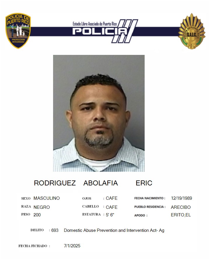Agente adscrita a la División de Violencia Doméstica del área de Arecibo, llevó a cabo una investigación que culminó en la tarde de ayer martes, con la radicación de cargos por los delitos del artículo 3.1 (Maltrato) y artículo 2.8 (Incumplimiento de órdenes de protección) de la Ley de Violencia Doméstica, por parte de la fiscalía, contra Eric Rodríguez Abolafia, alias Erito, de 35 años, residente del pueblo de Arecibo.