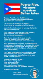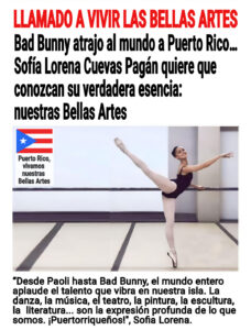 > “Desde Paoli hasta Bad Bunny, el mundo entero aplaude el talento que vibra en nuestra isla. La danza, la música, el teatro, la pintura, la escultura, la literatura… son la expresión profunda de lo que somos. Son llama encendida que revela nuestra verdad y nos une como pueblo”, expresó Sofía Lorena, bailarina y defensora acérrima del arte como motor de transformación social.