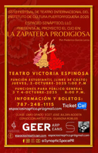 La obra, que se presentará en el Teatro Victoria Espinosa de San Juan, tendrá una función estudiantil gratuita el jueves 2 de octubre a la 1:00 P.M., seguida de funciones abiertas al público viernes 3 y sábado 4 de octubre a las 8:00 P.M.