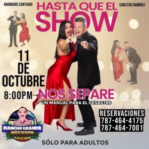 La producción reunirá a dos talentos de la comedia puertorriqueña Anamaris Santiago (El Remix) y Carlitos Ramírez (Día a Día), el próximo sábado, 11 de octubre, a las 8:00pm, en Rancho Grande Bar and Seafood de Añasco.