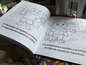 En las páginas del libro de colorear se señala la importancia del trabajo con compromiso y dedicación, y se hace un repaso de varias labores, como la promoción de la seguridad en las costas, la labor que realizan unidades como Emergencias Médicas, Protección Ambiental, y el trabajo voluntario en las comunidades.