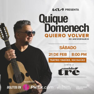 El cuatrista puertorriqueño Quique Domenech regresa a los escenarios de la isla para celebrar 40 años de trayectoria profesional con el emotivo concierto “Quiero Volver”, que se llevará a cabo el sábado, 21 de febrero de 2026, a las 8:00 de la noche, en el emblemático Teatro Yagüez.