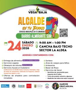 El Municipio Autónomo de Vega Baja anunció la celebración de la cuarta edición de la iniciativa comunitaria “Alcalde en tu Barrio”, que se llevará a cabo el sábado, 24 de enero de 2026, en la Cancha Bajo Techo del sector La Aldea, en el barrio Almirante Sur, en horario de 9:00 a.m. a 1:00 p.m.