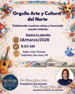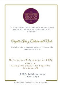 La senadora del Distrito de Arecibo, Hon. Brenda Pérez Soto, invita a los medios de comunicación a la actividad “Orgullo Arte y Cultura del Norte”, una iniciativa dirigida a reconocer a destacadas figuras de los municipios que componen el Distrito Senatorial de Arecibo por su aportación al desarrollo cultural, deportivo y social de Puerto Rico.