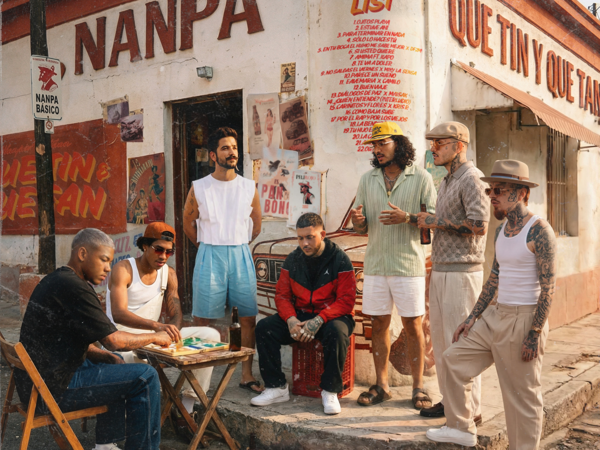 Nanpa Básico amplía el universo de “Que Tin y Que Tan” junto a un grupo de colaboradores que encajan de forma orgánica en el proyecto, incluyendo Kapo, Camilo, DFZM, Miky La Sensa, Maisak y Kris R. Todos aparecen en la portada del álbum, reunidos alrededor de una mesa de dominó frente a una bodega, en una escena que captura la cotidianidad y celebra sus raíces compartidas. La imagen funciona como una extensión directa del concepto del álbum, reforzando la conexión entre Nanpa y sus colaboradores tanto en lo musical como en lo cultural.